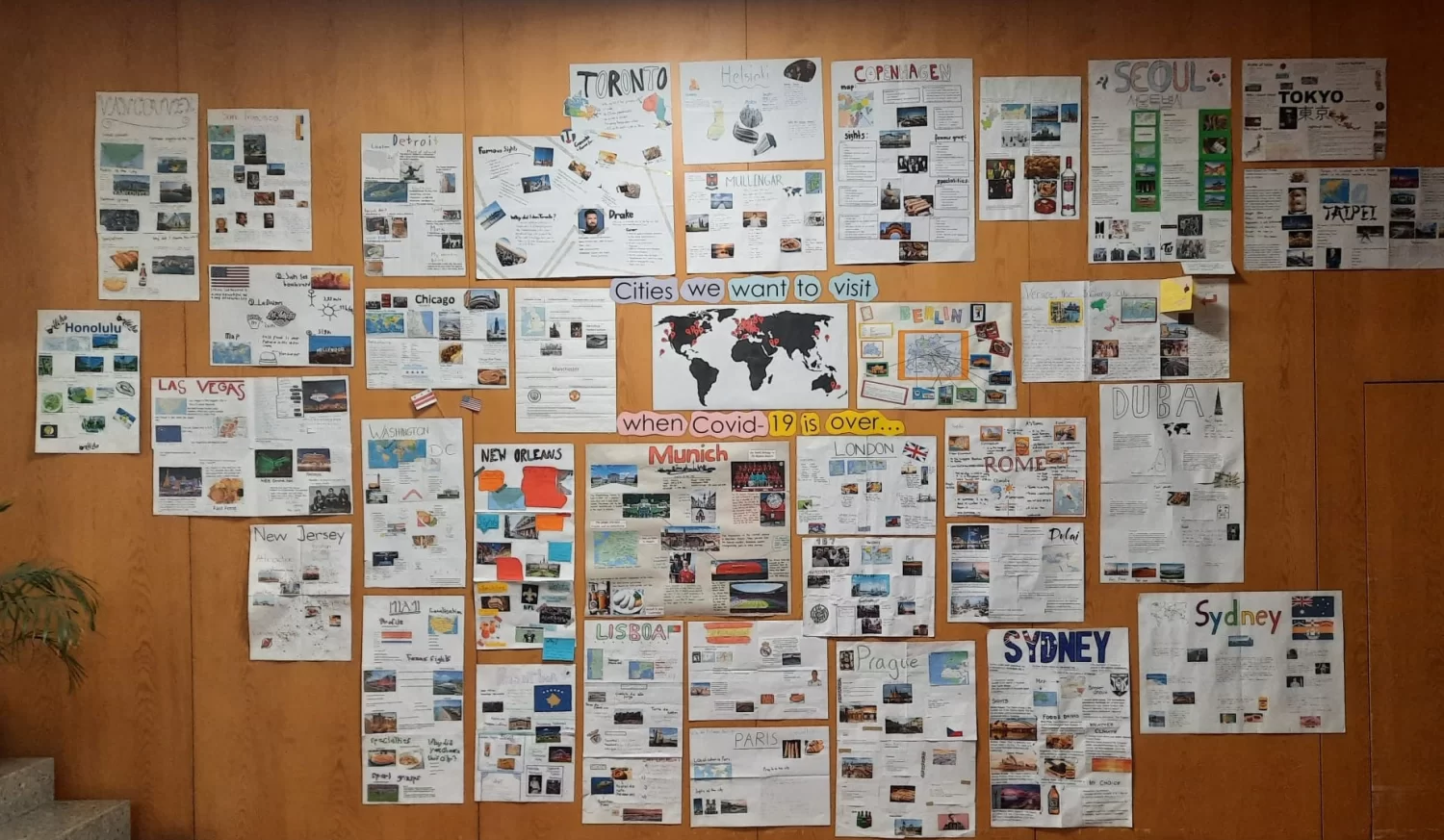 So haben wir trotz Corona einen Einblick in die verschiedenen Städte und Kulturen der Welt bekommen. Die ganzen Plakate haben wir an eine Wand der OS geklebt. Man kann es sich wie eine Bucket List von Reisezielen vorstellen. Unsere Wand stach sogar unserer Adjunktin Tanja Fux ins Auge und begeisterte sie.