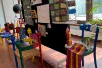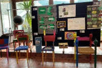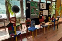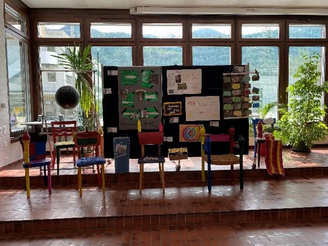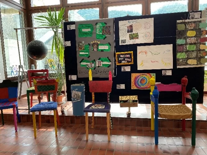 Die Schülerinnen und Schüler waren sehr kreativ. Es entstanden verschiedene Objekte wie eine Kugel mit Informationen und Bildern, eine Säule, eine Kiste oder ein Plakat und 6 ganz bunt gestaltete Stühle à la Hundertwasser.