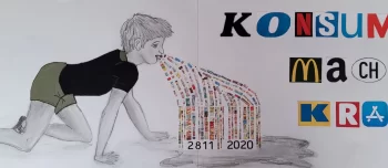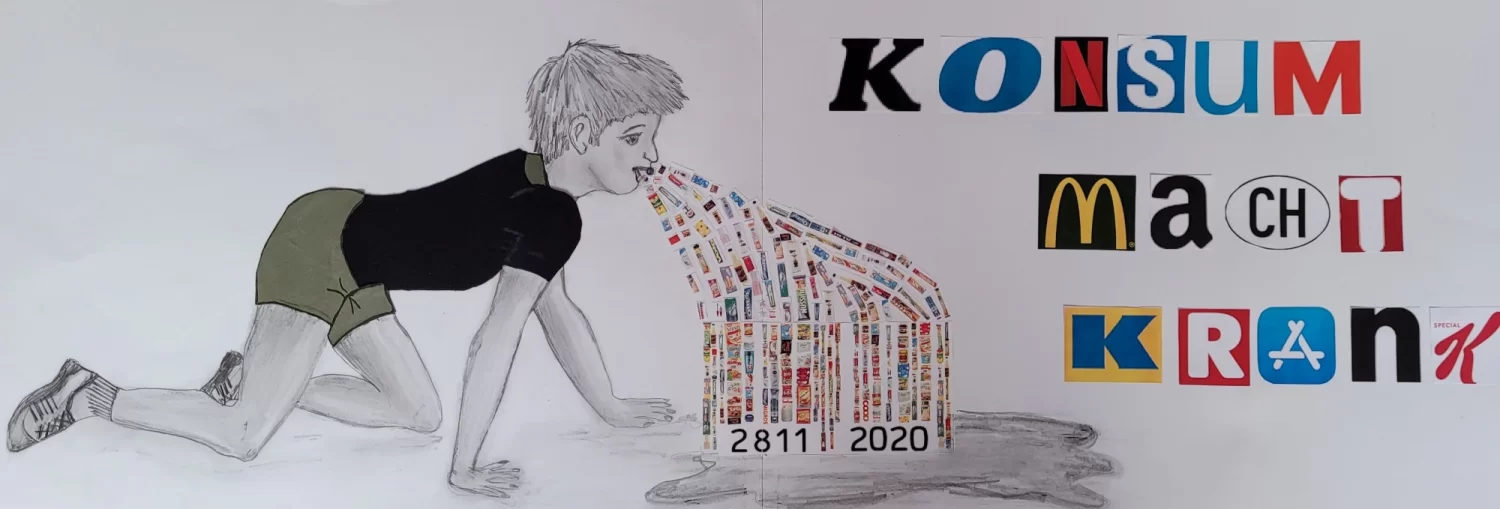 Diese irrsinnige Verschwendung soll mein Bild symbolisieren. Darauf ist ein Junge abgebildet, der erbrechen muss. Auf den 2. Blick sieht man, dass er Produkte in Form eines Strichcodes erbricht. Das Datum im Strichcode 28.11.2020 steht für den «Blackfriday». Der Tag, an dem extra viele Rabatte zum Kauf anregen. Manche nennen den «Blackfriday» auch den «Kauf-nix-Tag». Sie wollen so ein Zeichen gegen den unnötigen Konsum setzen. Der Titel «Konsum macht krank» soll wortwörtlich verstanden werden. Ich habe den Titel aus Marken-Lettern geschrieben, um noch einmal den Konsum durch Werbung zu verdeutlichen.