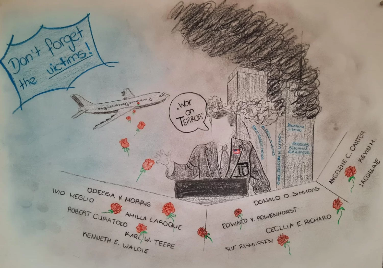 Ich habe mich bei meinem Mauergraffiti für den Anschlag auf die World Trade Center entschieden, da mich dieses Ereignis sehr mitgenommen aber auch fasziniert hat. Meine Aussage ist: „Don’t forget the victims!“ Lasst und die vielen, verstorbenen Menschen nicht vergessen.