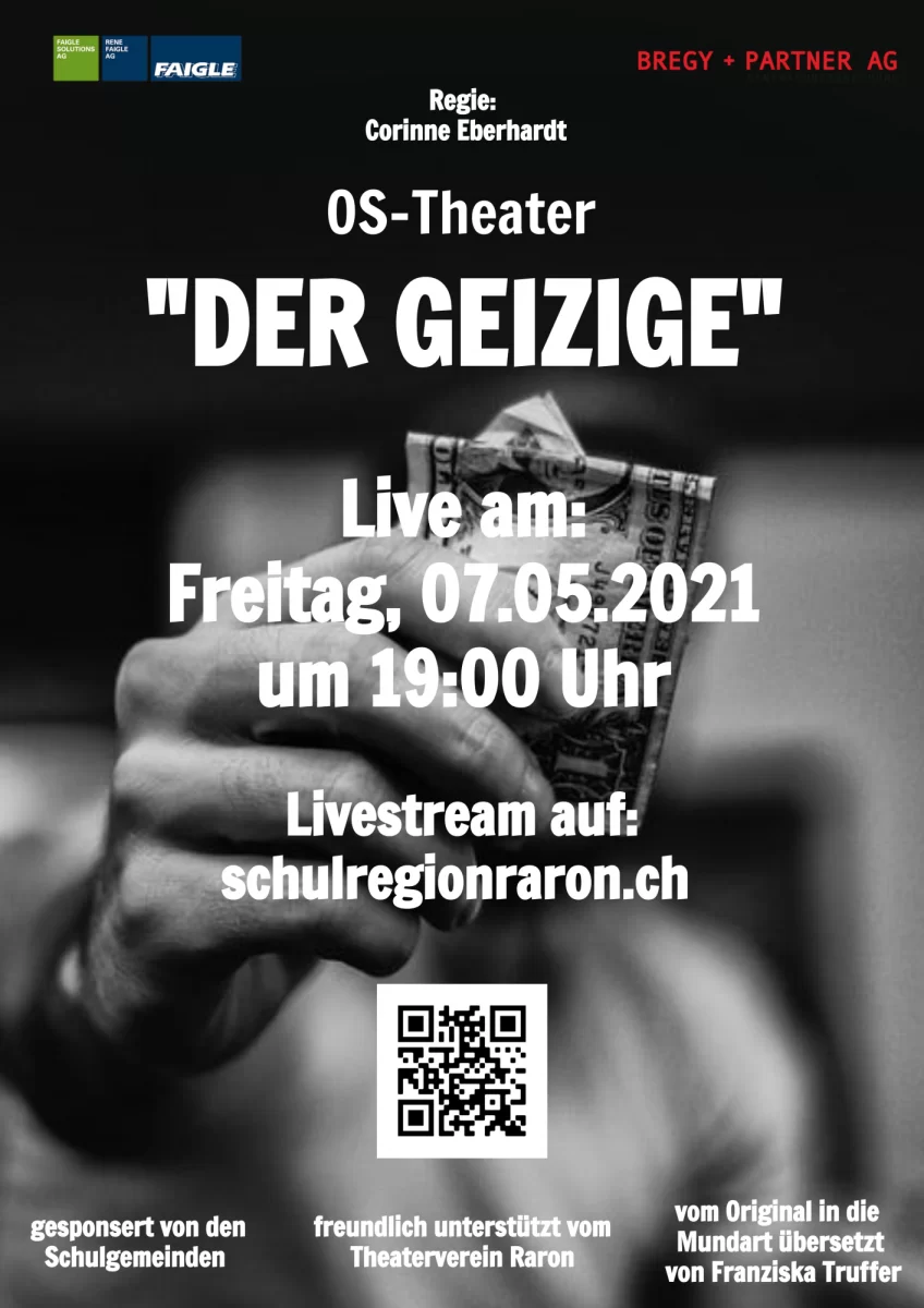 Im Januar begann die 11 OS Raron dann mit den Proben zum Theaterstück "Der Geizige". Nach der Rollenverteilung wurden die Rollen erst im Klassenzimmer und anschliessend in der Aula einstudiert. Ende April konnten dann die Proben auf der Bühne stattfinden. Dies ist ein anderes Erlebnis, mit all den Requisiten wie dem Sofa, den Möbeln etc. Alle Schauspielerinnen und Schauspieler begannen nach und nach mit den passenden Outfits zu proben. Die Spannung stieg stetig an und trotz der Mehrbelastung neben dem Unterricht durfte der Spass nicht fehlen. Die betreuenden Lehrpersonen und insbesondere die Regisseurin vermochten es, die Lernenden immer wieder zu motivieren und trotz der Ungewissheit über die Art der Aufführung bei Laune zu halten.