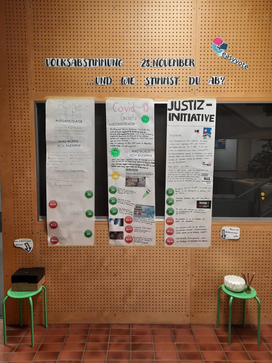 Wir, die 11 OS B, haben in der Schule im Fach Geografie und Geschichte die aktuelle Volksabstimmung diskutiert und Plakate über die Abstimmungen angefertigt: Pflegeinitiative, Covid-19-Gesetzt und Justizinitiative. Drei Lektionen hatten wir Zeit, um uns zu informieren, Material zu sammeln, Zeitungen und Flyer zu analysieren und die wichtigsten Informationen herauszuarbeiten.
