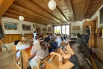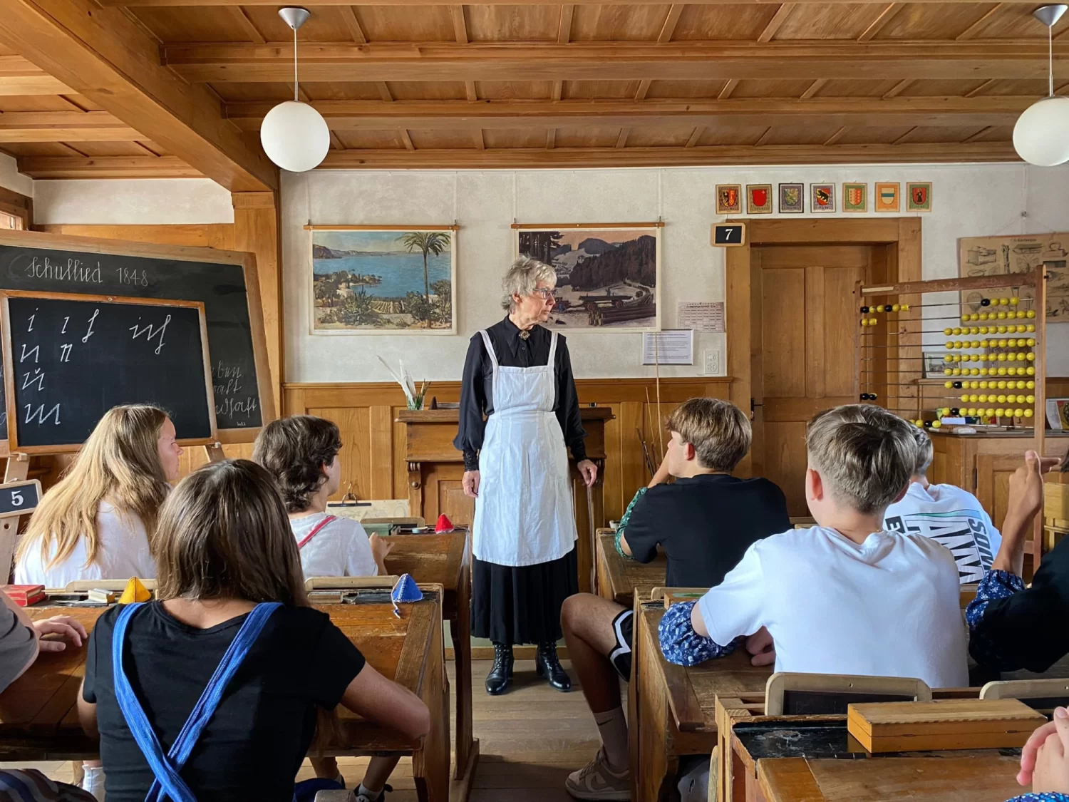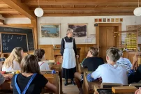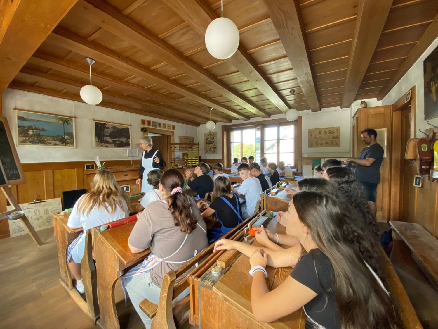 Die 11OS bekam im Sinne des Mottos der Projektwoche 'einst und heute' in Form eines Theaterspiels im Schulmuseum in Köniz eine Schullektion wie vor 100 Jahren vorgeführt. Wie gewohnt nahmen sie die Rolle der SchülerInnen ein, wurden jedoch taktvoll mit einem Stab angeführt und angeleitet Gedichte zu rezitieren, zu singen, in Kurrentschrift auf Schiefertafel einzelne Sätze in schöner Kalligrafie zu schreiben und der Geschichte der Schulentwicklung der letzten 120 Jahre zu lauschen. Es war ein gelungener Abschluss der Projektwoche und der Übergang in den Alltag der Schule von heute….