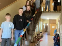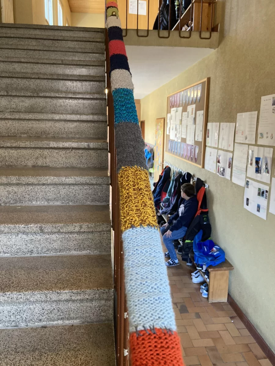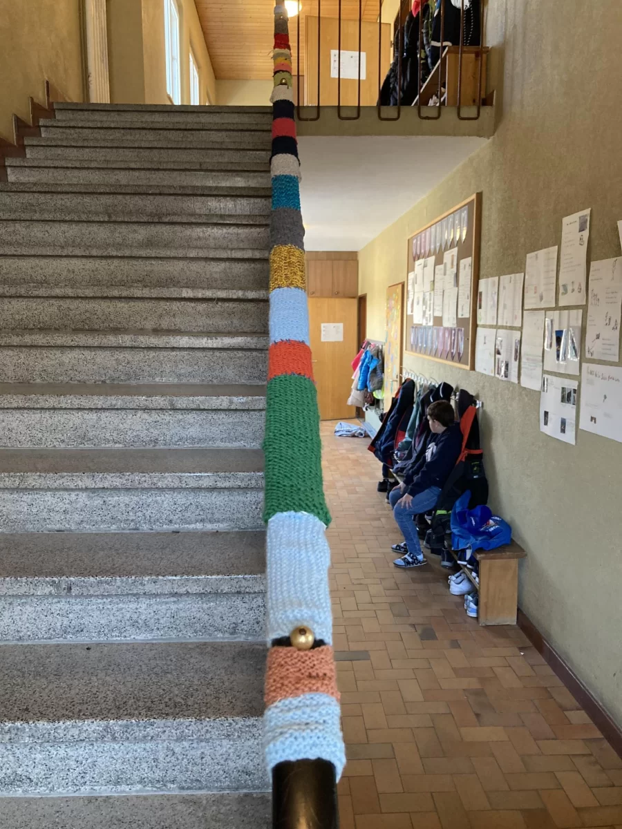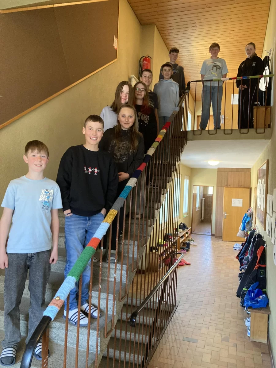 Die Schülerinnen und Schüler der 8H aus Unterbäch und Eischoll waren fleissig: gemeinsam haben sie gestrickt, was das Zeug hält. Das Ziel war es, das gesamte Treppengeländer mit den gestrickten Flächen einzufassen und dank einiger zusätzlicher Hilfe haben sie das auch geschafft.