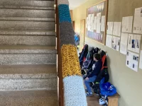 Die Schülerinnen und Schüler der 8H aus Unterbäch und Eischoll waren fleissig: gemeinsam haben sie gestrickt, was das Zeug hält. Das Ziel war es, das gesamte Treppengeländer mit den gestrickten Flächen einzufassen und dank einiger zusätzlicher Hilfe haben sie das auch geschafft.