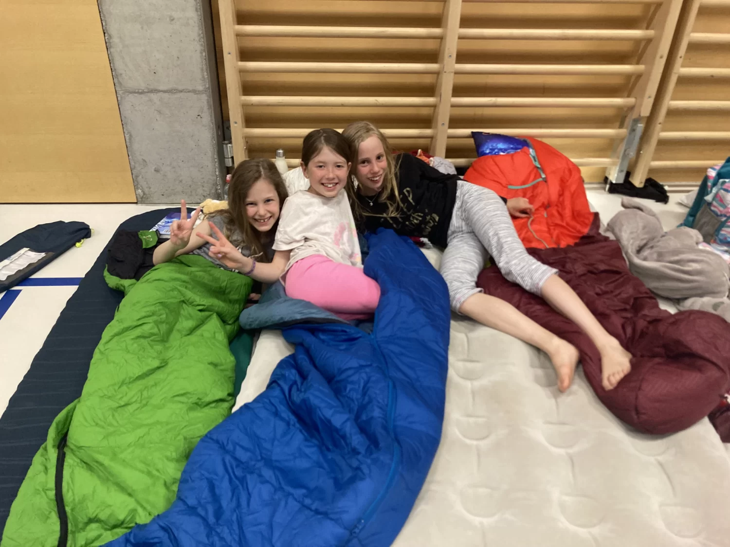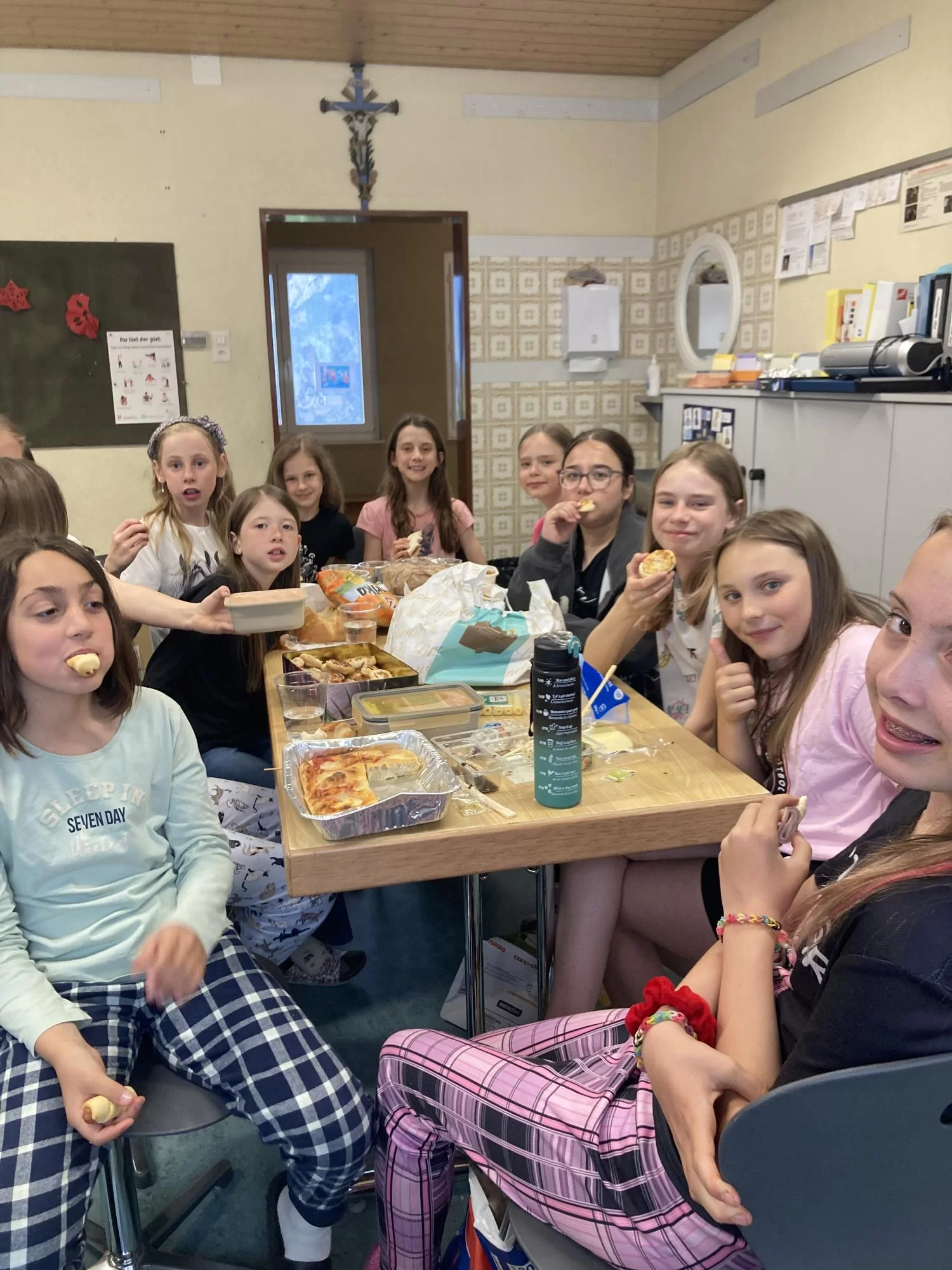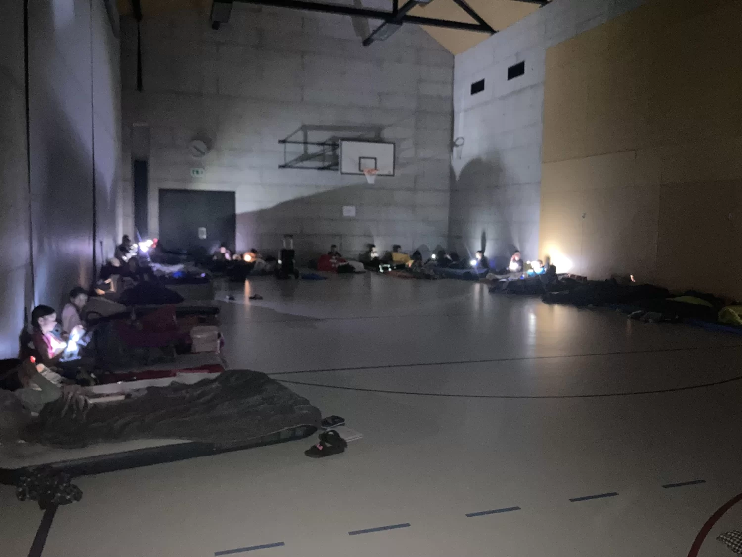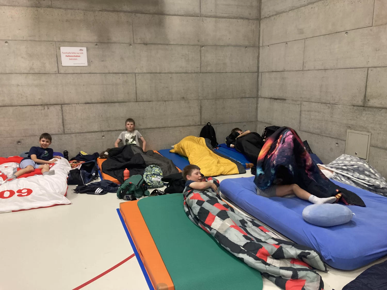 Nachdem die Schlafstätte in der Turnhalle eingerichtet worden war, gab's eine grosse Teileta für alle.