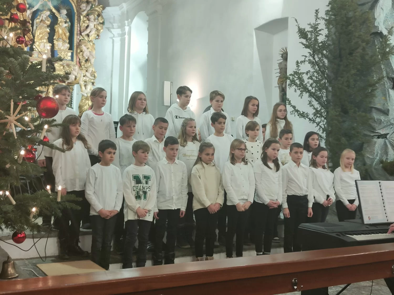 Das Weihnachtskonzert gibt es schon seit 40 Jahren. Beim Weihnachtskonzert müssen die Schüler schwarze und weisse Kleider anziehen. Die Schüler singen in der Kirche mit dem Chor und mit der Musikgesellschaft.Wir haben viel allein geübt. Wir haben in der Schule geübt, manchmal in der Kirche.Die Kirche war voll. Den Zuschauern hat es gefallen. Es hatte einen Hit. Alle in der Kirche haben applaudiert. Die Zuschauer wollten eine Zugabe.