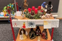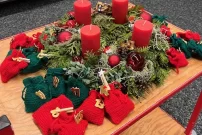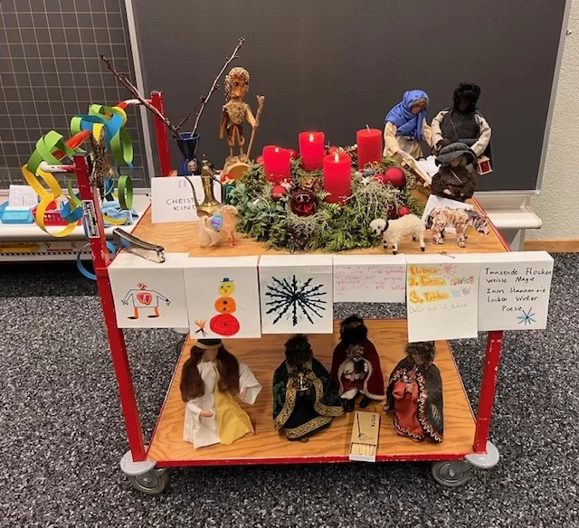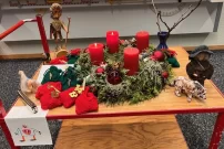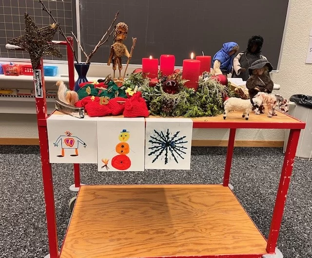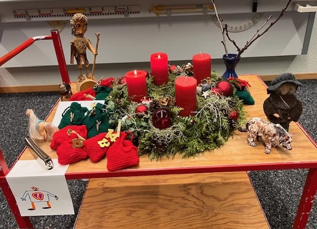 Am 1. Dezember starteten wir unsere Adventszeit mit einem Adventskalender und einem schönen Adventskranz. Jeden Morgen erzählte die Lehrerin eine Geschichte oder ein Märchen und stellte einen passenden Gegenstand zur Geschichte dazu. Neben Schokolade erhielten die Kinder jeweils auch eine kleine Adventsaufgabe.