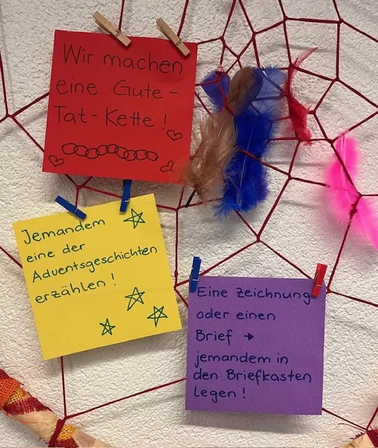 Auch unsere Wochenziele waren ganz im Zeichen der Weihnachtszeit gestaltet. In der ersten Woche schrieben die Kinder ein Briefchen oder fertigten eine Zeichnung an und legten ihr „Geschenk“ einer Person in den Briefkasten. In der zweiten Woche erzählten sie eine der Adventsgeschichten einer anderen Person weiter. In der dritten Woche gestalteten wir gemeinsam eine „Gute-Tat-Kette“, die wir am Weihnachtswagen befestigten.