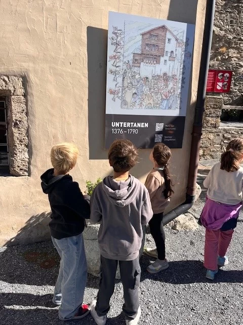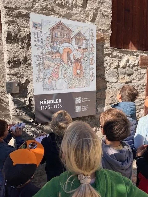 Zu unserem Thema 'In früheren Zeiten' machten wir uns auf eine Zeitreise in unser schönes Dorf und wie es dort vor 900 Jahren war. Die Kinder bekamen Informationen über verschiedene Gegebenheiten in den Jahren 1125 - 1790. In Gruppen lösten sie dann Aufgaben und erfuhren, wie die Geschtjiär als Säumer, Händler, Leibeigene und Untertanen lebten.