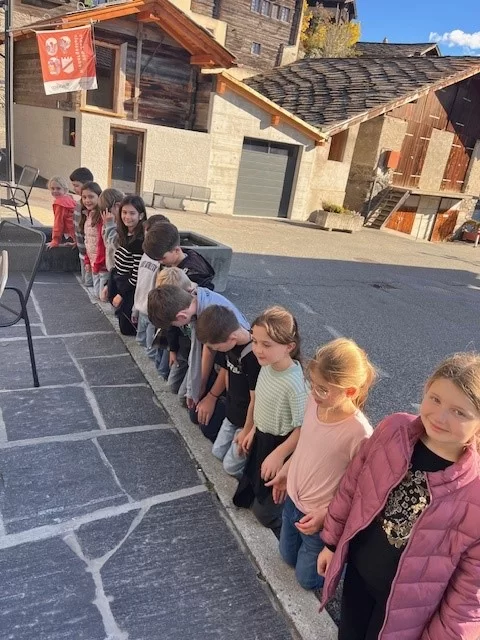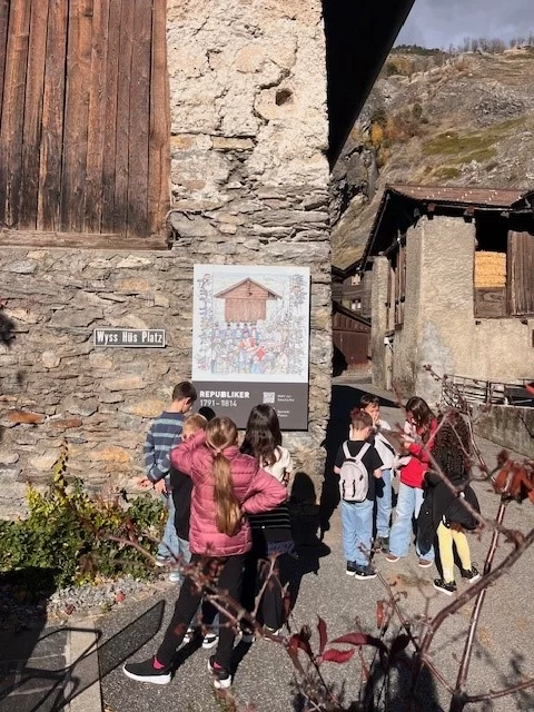 Bei schönem Wetter gingen wir am Nachmittag ins Dorf und lernten etwas über die Zeit, als die Niedergestler Republiker waren. Wir erfuhren auch etwas über Napolen und die Schule in der damaligen Zeit. Ausserdem erfuhren wir, dass 1815 das Wallis als 20. Kanton zu unserer Eidgenossenschaft dazu kam. Zum Schluss schauten wir uns das Zukunftsbild an. In dieser Woche werden wir uns in einem Kunstprojekt näher damit befassen.