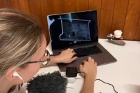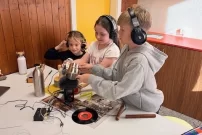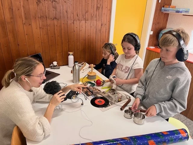 Es gab ein flauschiges Mikrofon, wir haben verschiedene Töne hergestellt Bilder gemalt von der Zukunft und lustige Szenen nachgespielt. Wir mussten lachen, wir mussten lustige Laute machen, es war cool, einfach spektakulär! (Laura, Amélie - 5H, Leony, Norwin - 6H)