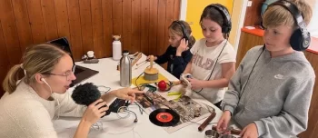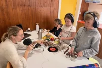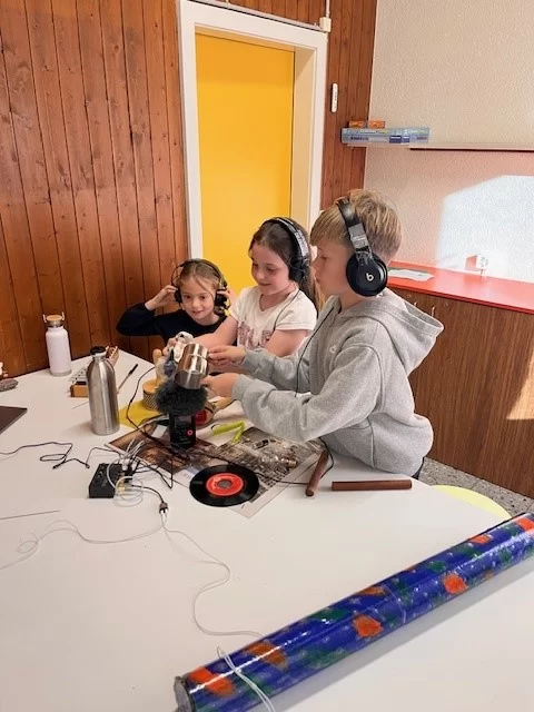 Wir haben zu verschiedenen Bildern Töne gemacht. Andere haben ihre Zukunftsbilder gemalt, vom Schulweg, Zuhause und übers Essen. Wir haben die Töne über Kopfhörer gehört und die Geräusche mit Xylophon, kleinen Pfannen und Zeitungen gemacht. (Hannes, Jano, Tiara - 6H, Julia - 5H)