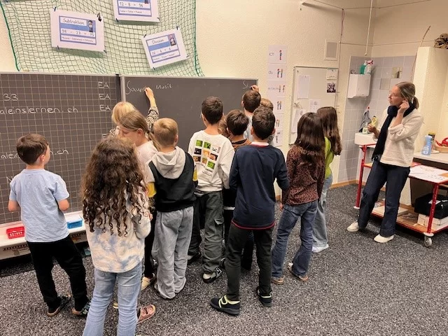 Wir haben einen coolen Film über Geräusche in Filmen und Dokumentationen angeschaut. Wir haben mit Mikrophonen Töne über die Zukunftsbilder gemacht. Und dann haben wir Bilder über unseren Schulweg in der Zukunft, unser Haus und unser Essen gemalt. Wir haben am PC Töne sortiert. (Rita, Curdin - 5H, Gabriel - 6H)