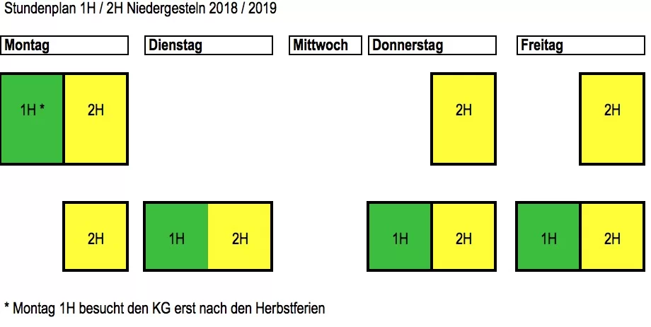 Für den KG Niedergesteln wurden für das Schuljahr 2018 / 2019 24 Lektionen bewilligt. Die individuelle Förderung wurde gestrichen. Darum hat sich die SD entschieden, das Blockzeitenmodell einzuführen (funktioniert in Raron schon einige Zeit)