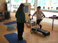 Auch die Physiotherapie hatte ihre eigene Station. Dort halfen kleine Therapeutinnen und Therapeuten den „Patienten“ bei Bewegungsübungen und Gleichgewichtstrainings. Viele Besucherinnen und Besucher kamen in der Physiotherapie richtig ins Schwitzen.