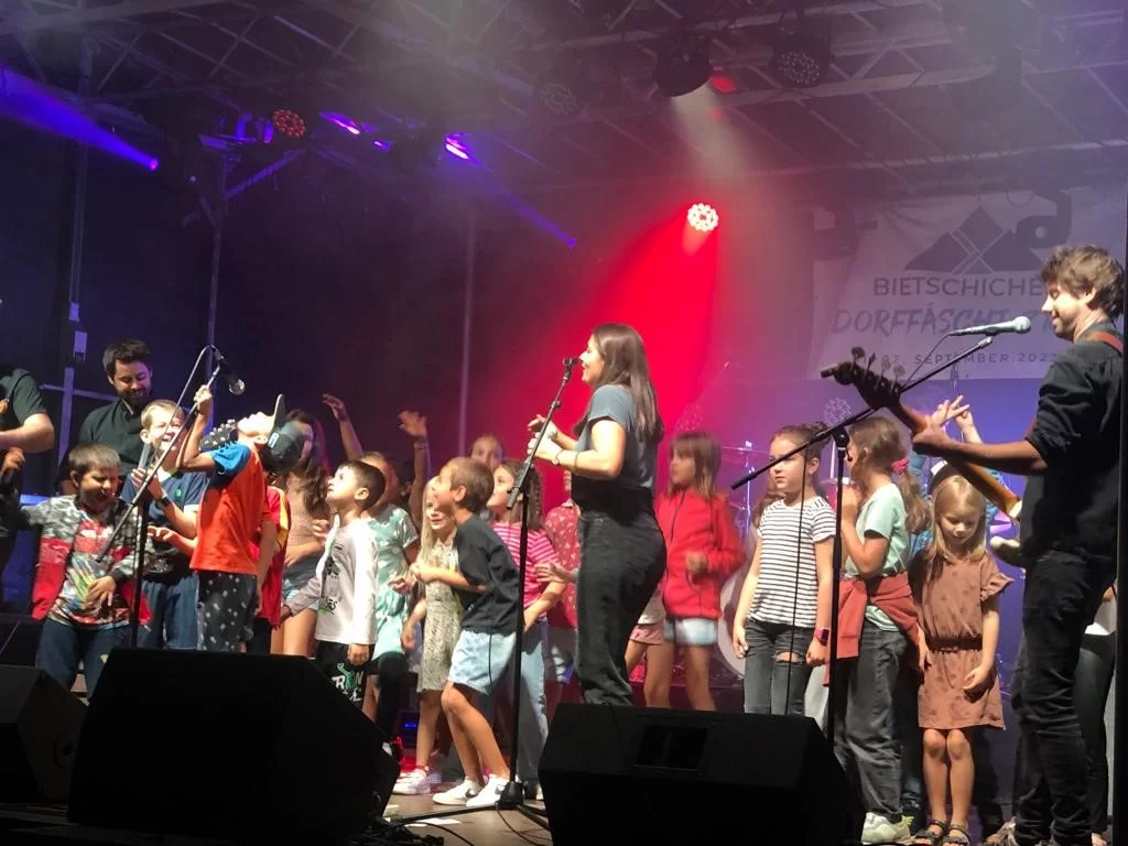 Endlich! Nach ganz vielen Jahren feierte Raron wieder einmal ein Dorffest. Das Wetter war herrlich, es wurde gegessen und getrunken und viele glückliche Kinder der Schulregion Raron genossen die Festlichkeiten in vollen Zügen. Um 18.30 Uhr eröffnete Frau Schaller mit ihrer Band "Triple H-B" das Dorffest. Mit ihrer unverkennbaren und rockigen Stimme starteten wir in ein wunderschönes Wochenende . Um 21.00 Uhr folgte dann der zweite Auftritt der Band "Riverbanks". Auch dort ist die Frontfrau eine unserer Lehrerinnen. Frau Feller, gemeinsam mit ihren Jungs, verzauberte uns allen mit ihrer wunderschönen Stimme. Mal rockig und schnell, dann wieder eine Ballade und der absolute Höhepunkt war sicherlich am Schluss, als alle Kinder mit Frau Feller auf die Bühne gehen konnten!
