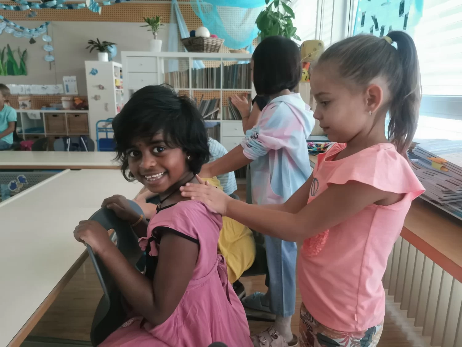 Der Buchstabe der Woche war heute der Mm. Dafür brauchte es einige Vorbereitungen. Alles wurde abgedunkelt, Kerzen wurden angezündet, eine Duftlampe gab es auch, damit unser Zimmer richtig gut duftet... und dann waren wir bereit für den M wie Massage. Die Lehrerinnen haben eine feine Massagecrème mitgebracht. Einmal durfte man massieren, einmal hat man massiert und wir alle haben es unglaublich genossen. Am Schluss gab es noch ein Zauberöl auf den Nacken und einen guten Wunsch ins Ohr. Diese Wohlfühllektion werden wir wahrscheinlich nicht so schnell vergessen...