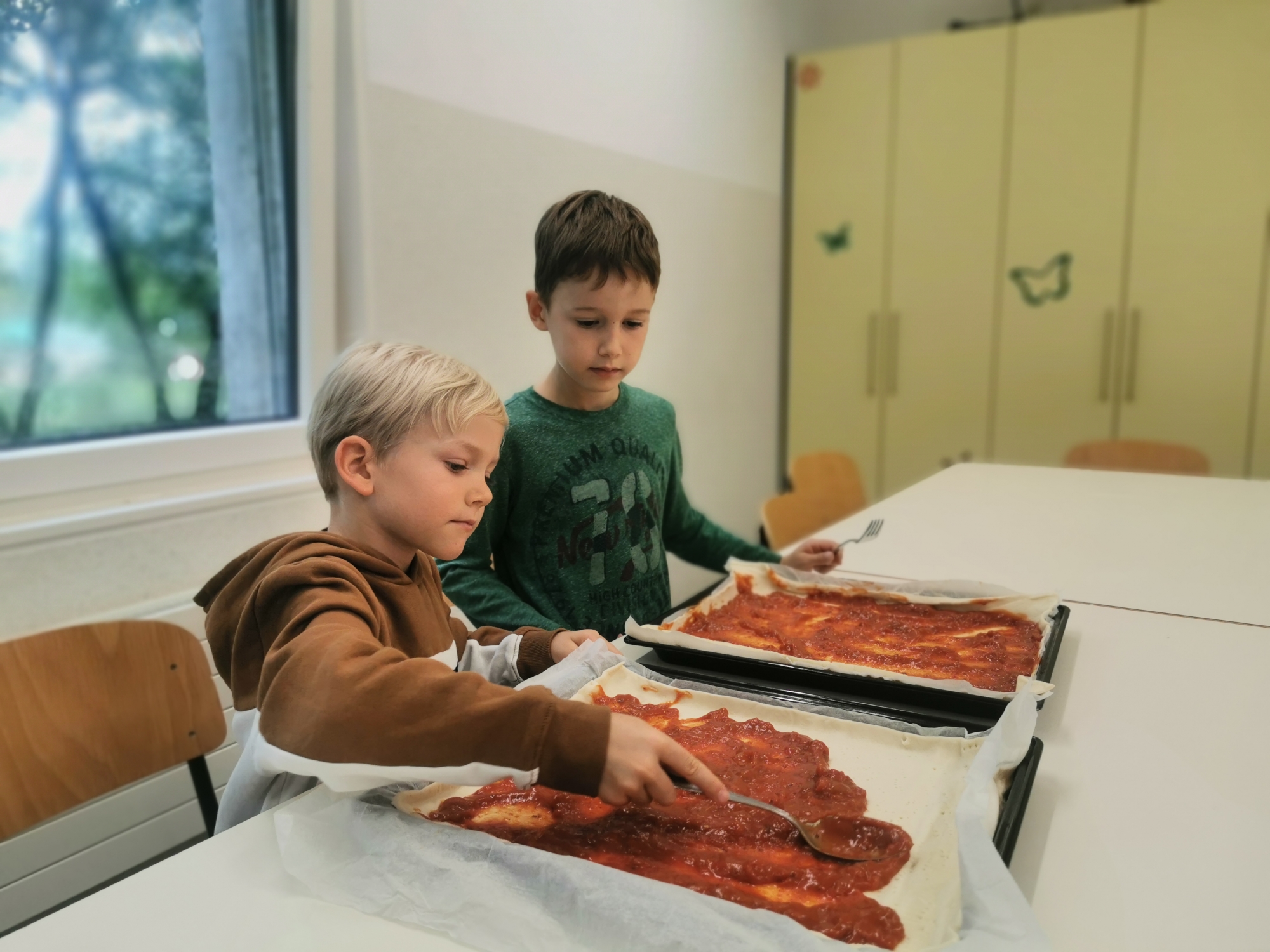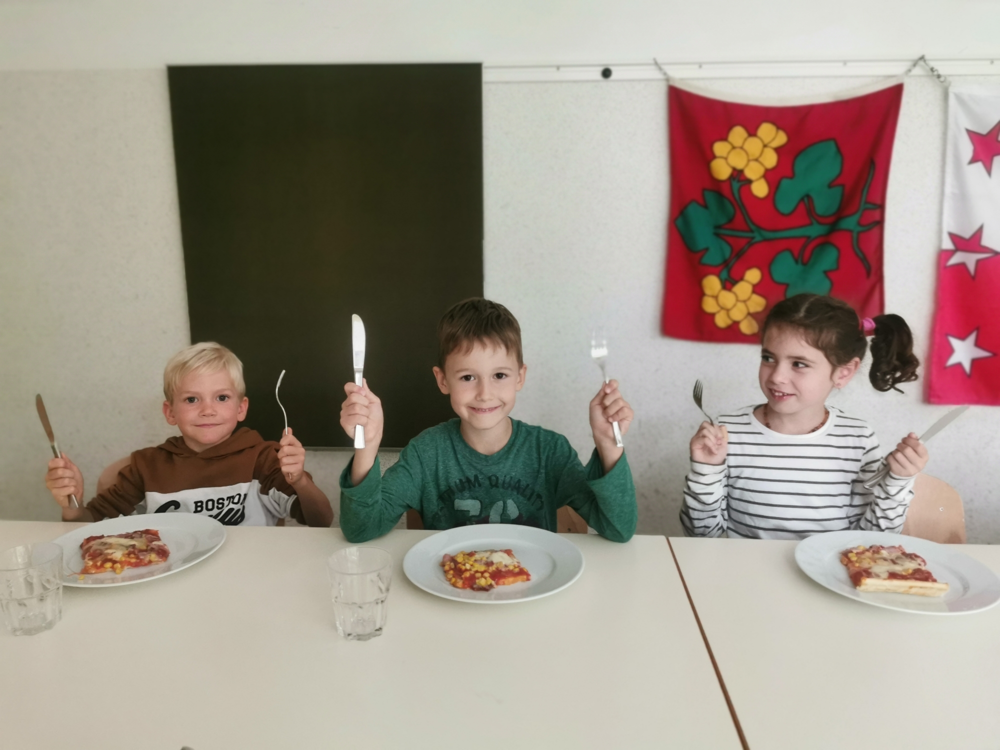 Als Belohnung durften sie dann in der Schule kochen und essen. Unsere drei Chefpizzaiolos haben die Lehrerinnen mit super feinen Pizzas überrascht. Auf die leckere Tomatensauce kam noch Schinken, Salami, Ananas, Mais und Käse. Ein frischer grüner Salat gabs dazu und zum Dessert ein kleines Schokobrötchen.