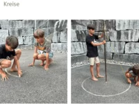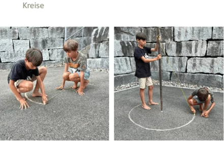 Wie die Kinder aus dem Mathebuch der 6H, konnten die Füchse von Frau Constantin, zusammen mit Frau Schaller draussen auf unserem Pausenplatz auch erste Versuche mit selbstgezeichneten, runden oder weniger runden Kreisen machen. Sie haben gemerkt, dass es gar nicht so einfach ist mit Stock und Schnur einen geschlossenen, runden Kreis zu zeichnen. Anschliessend bekamen sie, nach riesengrosser, freudiger Erwartung, ihr Hilfsmittel den Zirkel zur Hand. Damit üben sie nun fleissig schöne Kreise zu zeichnen.