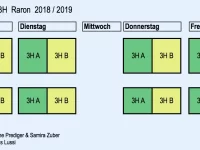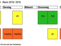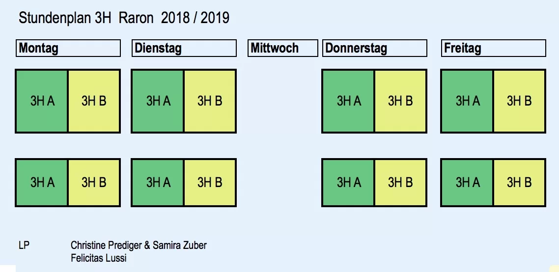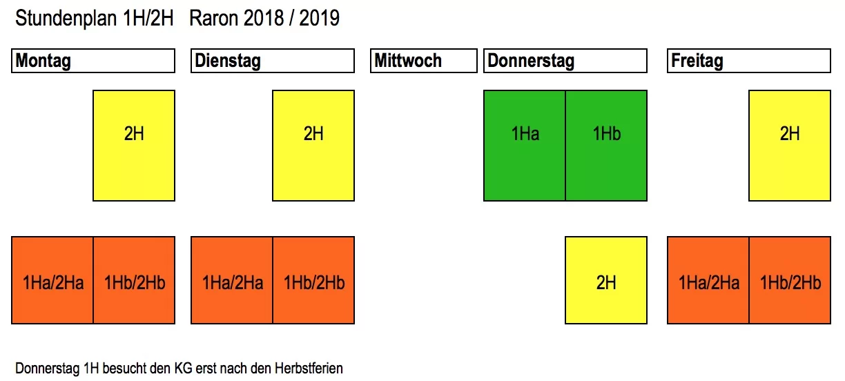 Da nur 16 SuS in einer Klasse sind, fällt das Alternieren weg. Für beide Klassen ist der Mittwoch unterrichtsfrei. Die Unterrichtszeiten sind für alle Klassen (3H - 8H) von 08.00 - 11.30 und von 13.30 - 16.00 Uhr