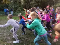 Zum Einturnen tanzen wir in der Turnhalle zu einem lustigen Lied. Dann bildeten wir Gruppen. Es spielte z. B. Der schlaue Blitz gegen die Zwiebelsäcke. Wir konnten alle Posten machen, denn es war schönes Wetter und sehr warm. Trinken war sehr wichtig!