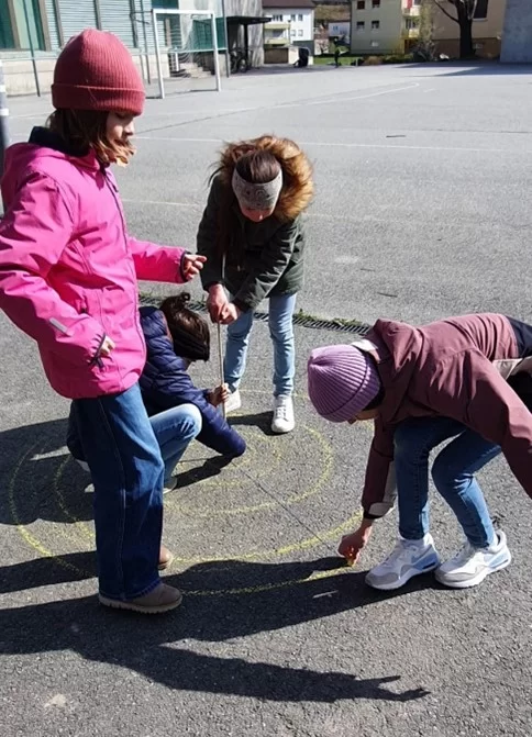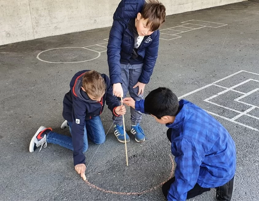 Teller, PET-Flaschendeckel, Frisbee, Teelicht usw. damit sind wir ins neue Mathematikthema gestartet. Die Kinder haben bald einmal begriffen, dass es um Kreise und den Zirkel geht. Es kamen viele tolle Ideen, wie man selbst schöne, saubere Kreise zeichnen kann. Unter anderem auch die Idee mit einem Stock und einem Faden. Diese Idee haben wir dann auch bei schönem Frühlingswetter ausprobiert. Anbei ein paar Eindrücke von unseren Versuchen...