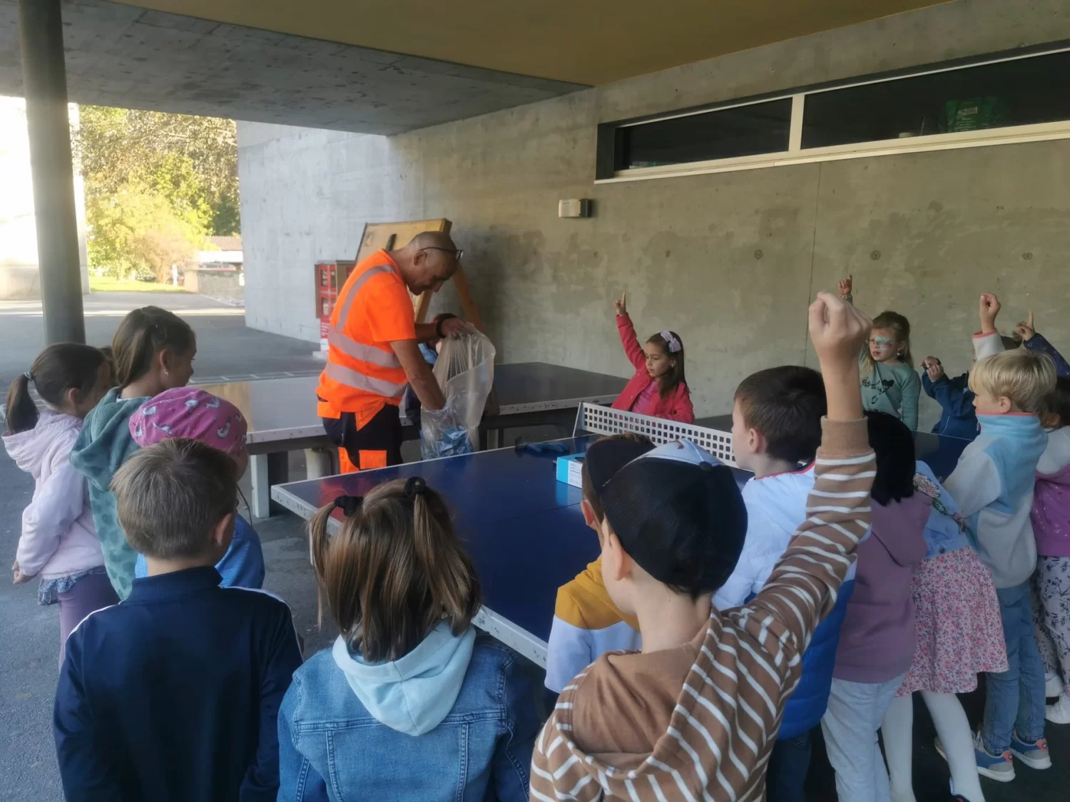 Wir haben uns heute alle riesig gefreut und konnten es kaum erwarten, bis es endlich 9.00Uhr war, denn auf dem Programm stand heute: Clean-Up mit Frängi. Draussen wartete er schon auf uns, bepackt mit Handschuhen und Müllsäcken. Wir haben nicht schlecht gestaunt, als Frängi uns berichtete, wie lange es dauert, bis PET-Flaschen, Papiere, Plastik, Zigarettenstümmel und noch vieles mehr zersetzt sind. Wir sind dankbar, dass wir so viele wichtige Sachen zum Thema Müll heute erfahren haben. Uns wird wieder mal bewusst, wie wichtig es ist, dass wir Sorge zu unserer Umwelt tragen, denn es gibt keinen PLAN B! Mit diesem ganzen Wissen haben wir uns dann am Schluss noch auf die Suche nach Abfall, rund um das Schulhaus, gemacht. Und wir waren sehr glücklich und ziemlich stolz, dass wir nur wenig Abfall gefunden haben. Gerne werden wir im Frühling mit Frängi nochmals eine Clean-Up-Day machen und dabei freuen wir uns dann ganz fest auf das versprochene und wohlverdiente Eis:).