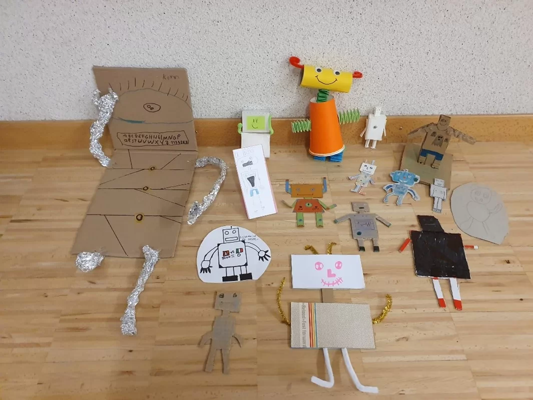 Im Französisch arbeiten die Kinder der 6H mit Robotern. Sie lernen wie sie funktionieren, was sie brauchen, wozu sie nützlich sind und mit verschiedenen Berufs-Robotern lernen die Kinder die Berufe auf Französisch kennen. Mit Hilfe der selbstgebastelten Roboter der Kinder, haben sie die Präpositionen (auf, in, neben, links von, rechts von, vor, hinter, neben) trainiert. Par exemple: Le robot gobelet est à côté du robot alien.