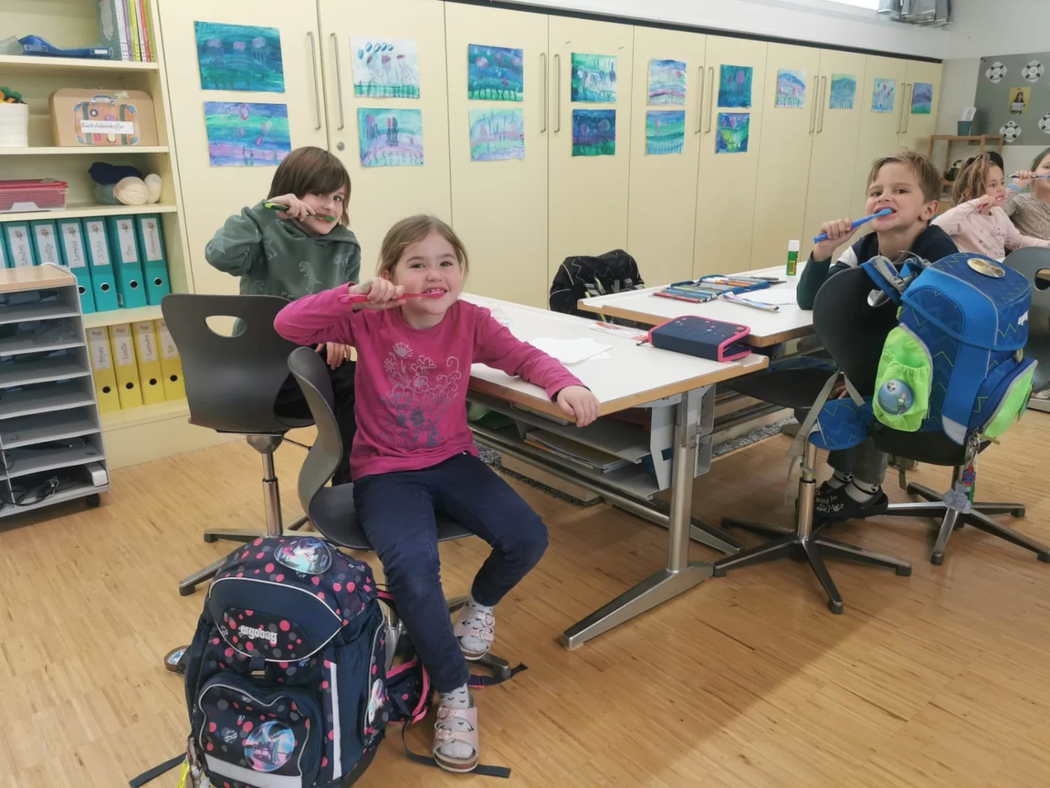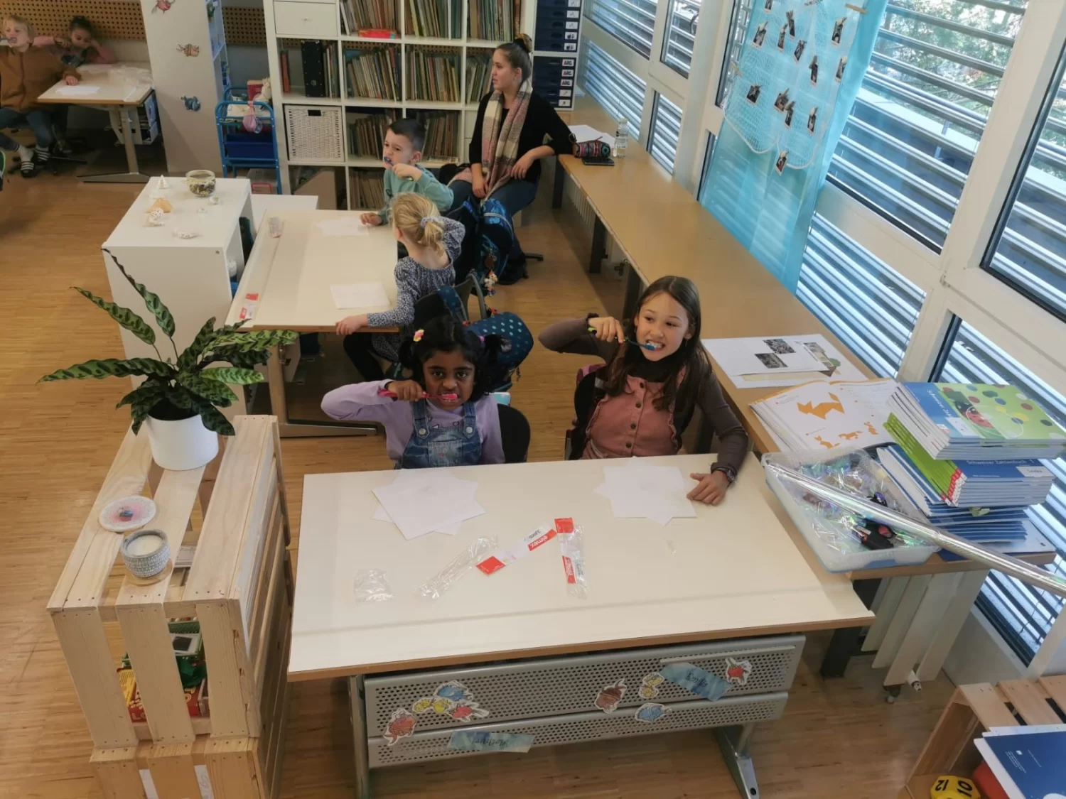 ... und wenn Beatrice da ist, dann wissen wir genau, dass wir unsere Zähne blitzeblank putzen. Wir durften ein schönes Zahnbürstchen kaufen, ganz fleissig unsere Milchzähne putzen und zum Schluss gab es sogar noch einen tollen Film über Tim und Lea.