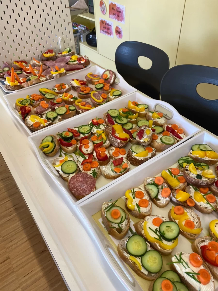 Am Freitagmorgen wurde dann geschnippselt was das Zeug hielt. Mit der Unterstützung von Frau Kämpf zauberten die Miesmuscheln nicht nur leckere Fruchtspiessli und wunderschöne Pausenbrötli, sondern verwöhnten uns auch mit leckeren Schinken-Salami-Käse-Rollen.