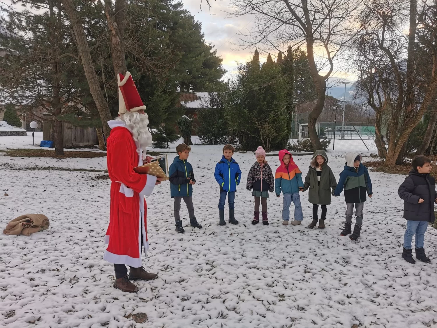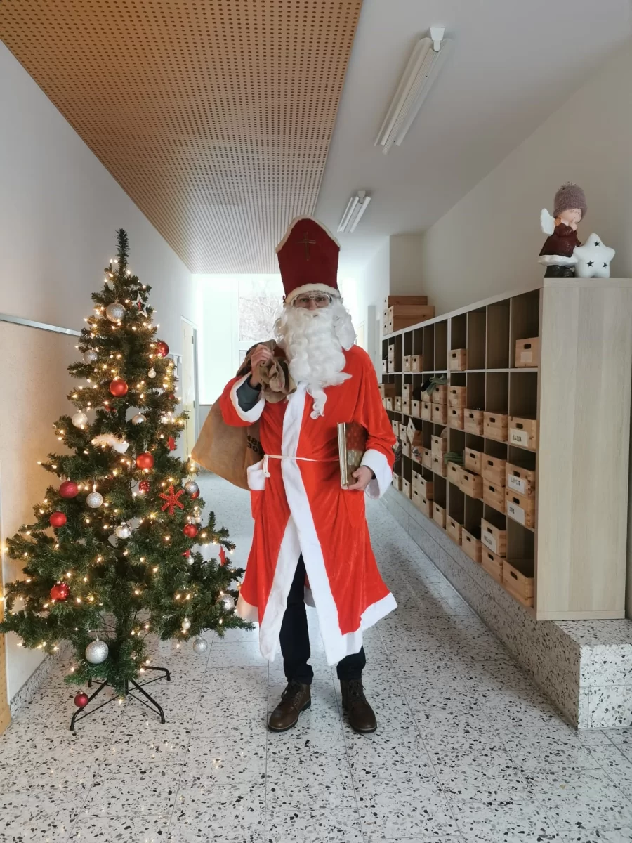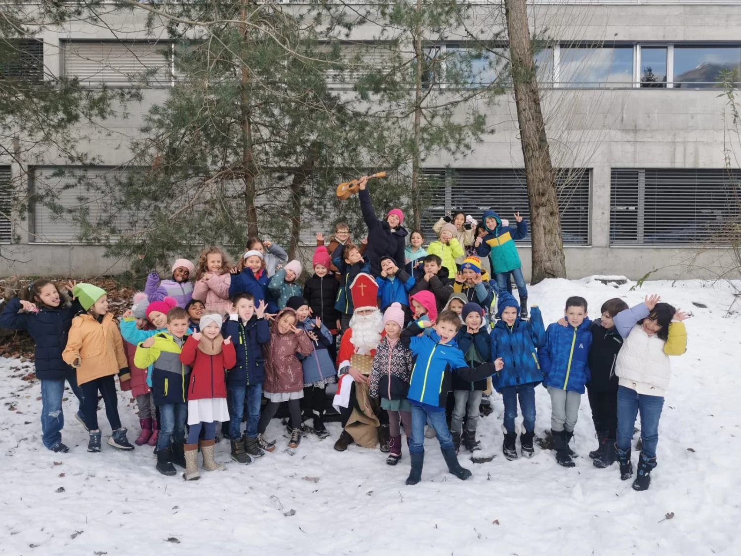 Früh morgens um 8.10 Uhr hörten wir draussen ein Klingeln. Ganz aufgeregt stürmten die kleinen Kinder nach draussen und dann sahen wir ihn zwischen den Bäumen stehen. Der Nikolaus stand mit strahlenden Augen, einer Glocke in der Hand und dem grossen Jutesack auf dem Rücken hinter unserem Schulhaus. Obwohl wir ganz nervös waren, trauten wir uns sofort auf den Nikolaus zuzugehen. Er war ganz lieb, erzählte uns, dass er den langen Weg aus dem Lötschental auf sich genommen hatte, um uns zu besuchen und wir staunten nicht schlecht, dass er so viel über unsere Klasse wusste. Wir spitzen unsere Ohren und als er uns dann noch erzählte, dass er sogar unseren Wichtel "Lulo" kennt, waren wir alle total aus dem Häuschen.