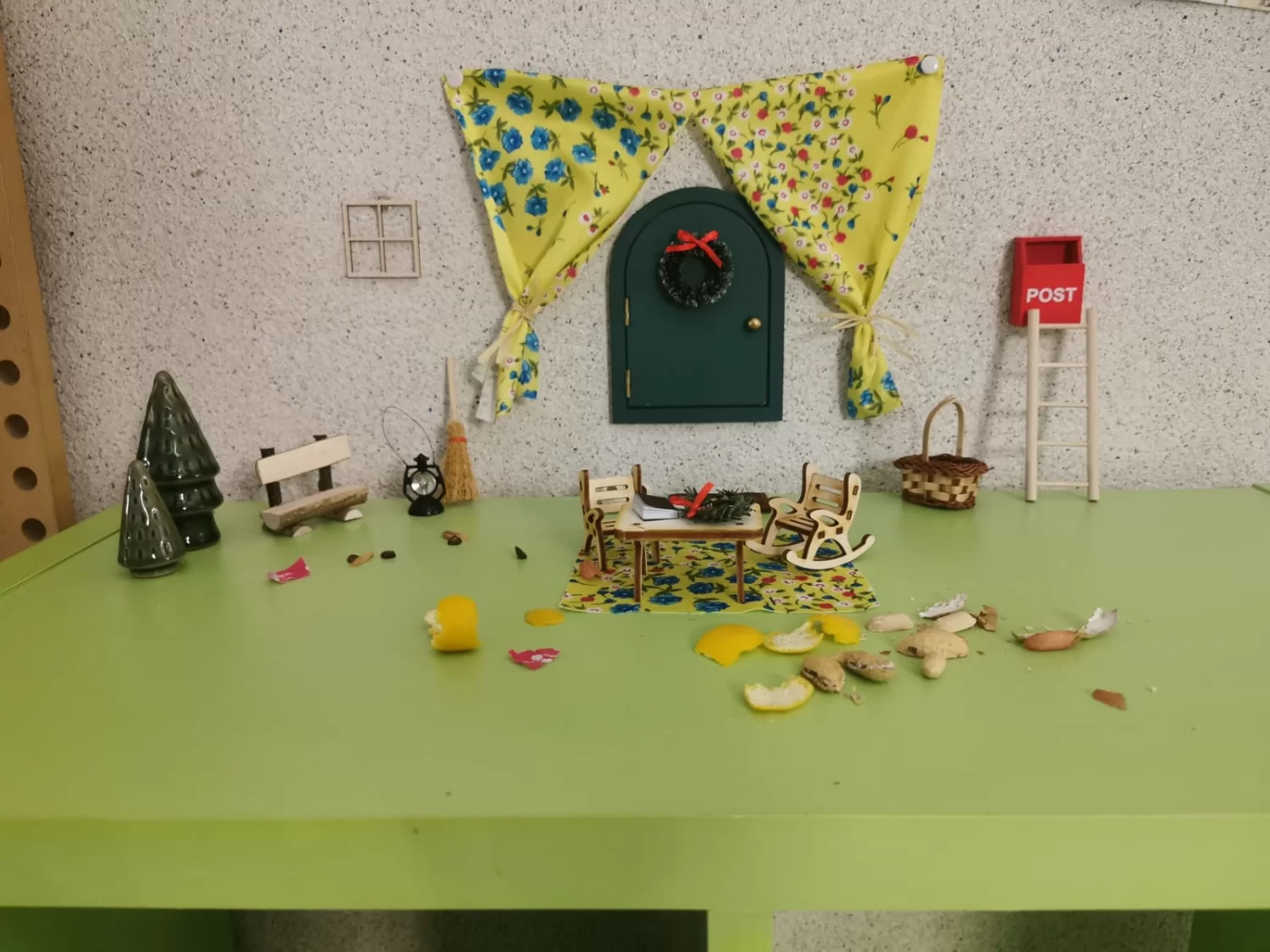Heute glänzten viele Kinderaugen, als wir sahen, dass Lulo eingezogen ist und es sich schon so richtig gemütlich gemacht hat. Ein wunderschöner Vorhang, mit dem dazupassenden Teppich, eine tolle Sitzecke, draussen neben den Tannenbäumen steht ein Bänkli zum Verweilen, die Schuhe stehen sauber und ordentlich neben dem Eingang - einfach toll! Und genascht hat Lulo, einfach unglaublich. Die Kinder waren dann doch ein wenig erstaunt, als sie merkten, dass Lulo den Abfall nicht entsorgt und ihn einfach irgendwo liegen lässt. So fanden wir vor seinem Haus Nuss- und Mandarinenschalen, Schokoladenpapier und viel Gebrösel. Vielleicht sollten wir Lulo mal einen Brief schreiben und ihm erklären, wo der Abfall hin kommt. Zum Glück ist da noch Rita, die dafür sorgt, dass alles sauber und ordentlich ist. Und natürlich können wir unserem kleinen Lulo nicht böse sein. Wir denken nämlich, dass er noch ein sehr, sehr junger Wichtel ist.