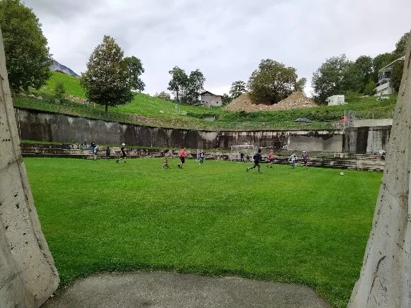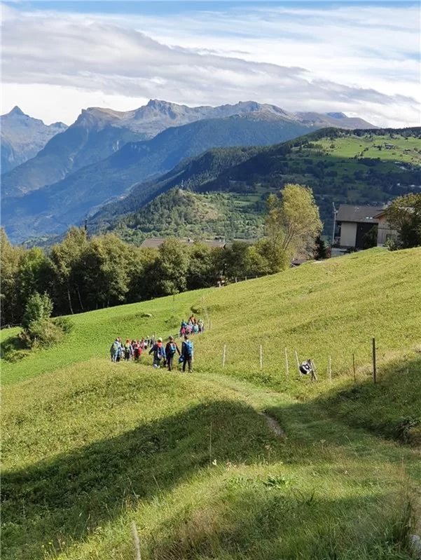 Am Freitag, 22. September durften die beiden Klassen 8H und 7H/8H auf ihrer Herbstwanderung gemütlich von Geimen nach Bitsch laufen. Zum Glück ging es den meisten Weg bergab. An machen Orten mussten wir sogar unsere Kletterfähigkeiten auspacken. Kurz bevor wir in Bitsch ankamen, überquerten wir eine Hängebrücke. In Bitsch verbrachten wir die Mittagspause auf dem Fussballplatz. Es hatte einen Spielplatz und Rasen, um Fussball oder Volleyball zu spielen. Morgens nieselte es noch, was uns nicht vom Spielen abhalten konnte. Nach der Mittagspause hatten einige Fusballspieler dann halt nasse Hosen ...